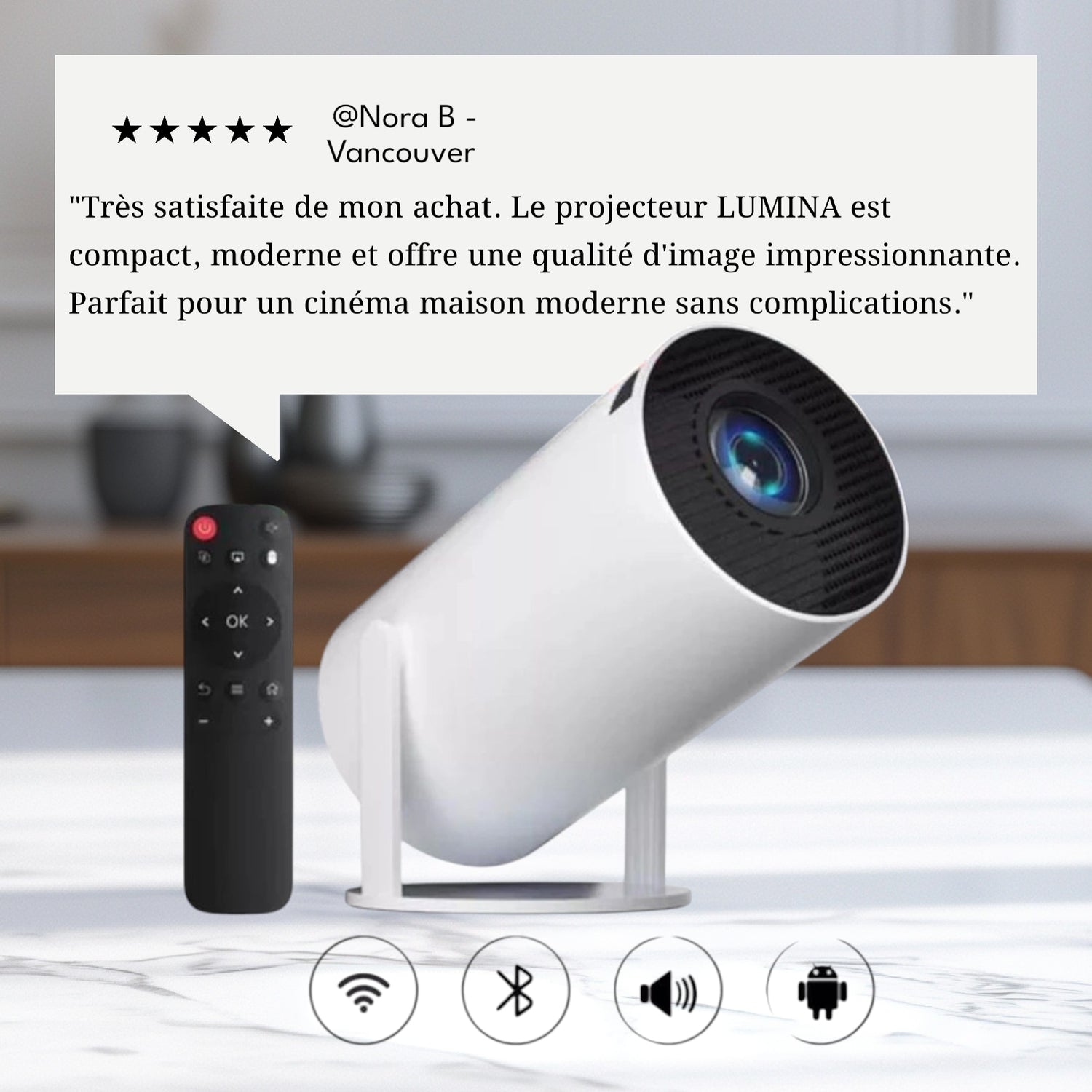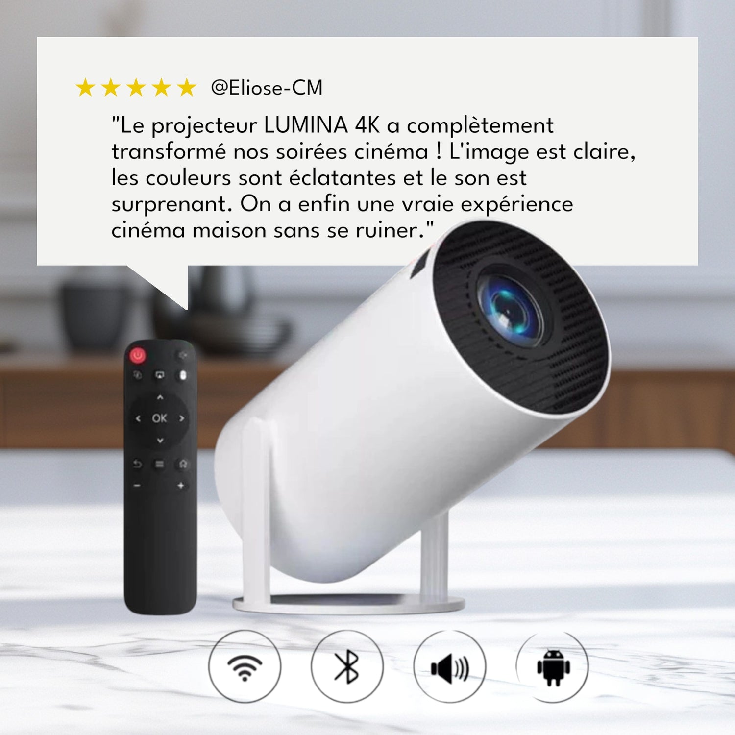 Le LUMINA 4K est un projecteur haute définition conçu pour offrir une expérience cinéma maison immersive. Compact, élégant et puissant, il projette jusqu’à 300 pouces avec une qualité d’image 4K exceptionnelle et un son stéréo intégré.
